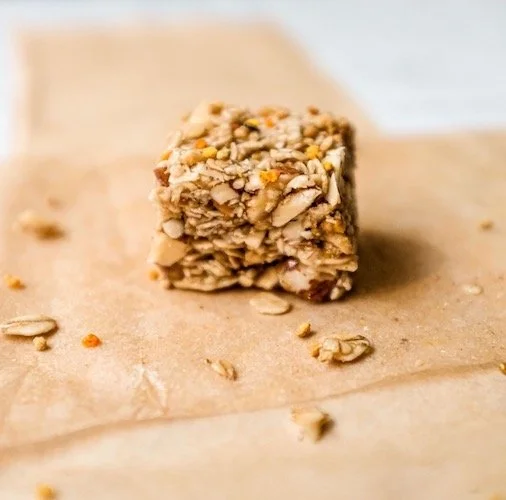 Transfer the sliced almonds to a mixing bowl and add the rolled oats, jumbo oats, and bee pollen. Once they’re completely cool, add the flaked almonds and stir everything together until evenly combined, using a fork so as not the break the flaked almonds.