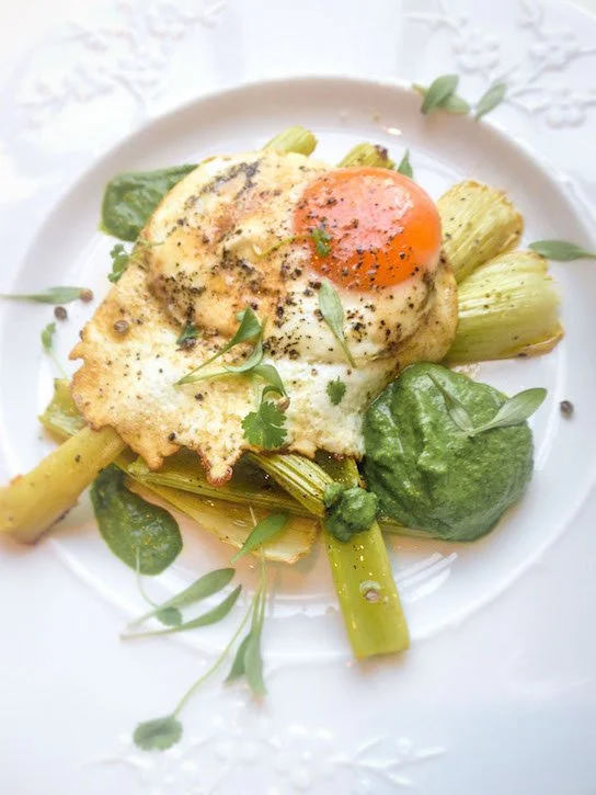 Roasted celery · Crispy fried egg · Coriander coconut kefir cream